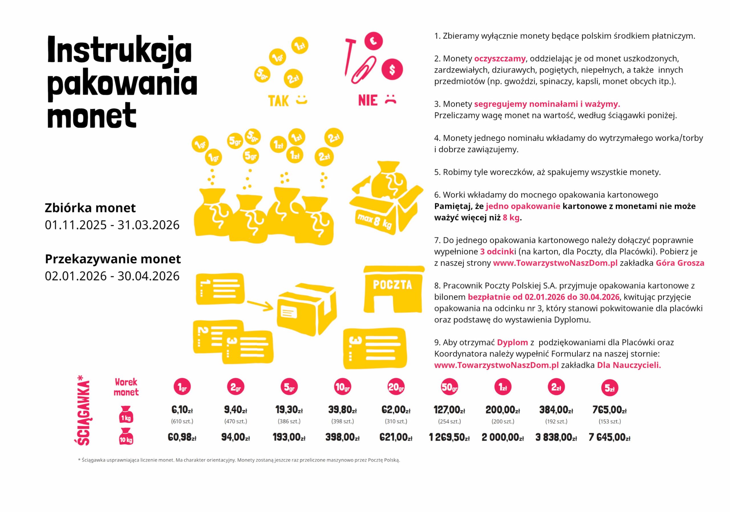 2. Możliwa jest zbiórka większych nominałów, jednakże dla organizatorów akcji podstawowym celem jest uświadomienie dzieciom i młodzieży, że najdrobniejsze monety zebrane w tak dużej ilości mogą stworzyć fundusz, dzięki któremu udzielona zostanie pomoc bardzo wielu ich koleżankom i kolegom, którzy znaleźli się w trudnej sytuacji życiowej.